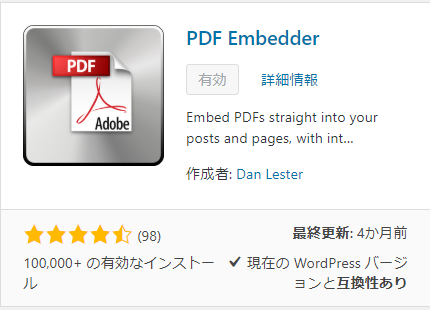 wordPresswでPDFファイルを表示 プラグイン PDF EWmbedderをインストール。 ページ上にPDFファイルを表示するプラグインです。 管理画面よりプラグインをクリック 新規追加をクリック “PDF Embed”で検索 以下のプラグインをインストール あとはメディアに追加して張り付けるだけ 写真の貼り付けと同じ手順です